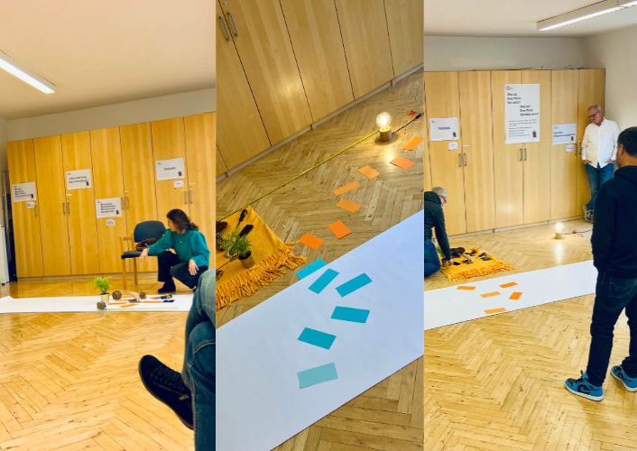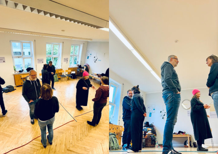 Der Workshop startet mit einem Raumlauf zum Thema Zeit und Geschwindigkeit, der die Teilnehmenden in Bewegung brachte und erste Begegnungen ermöglichte. Danach ging es darum, Bühnenerfahrungen zu sammeln: Jeder wählte einen Begriff, der besonders ansprach, und gestaltete mit einem Partner eine „soziale Skulptur“. Diese Skulpturen entwickelten sich in den Rolleninterviews weiter, und schließlich formte die gesamte Gruppe eine beeindruckende gemeinsame Skulptur. Mit dieser ersten Erfahrung von Rollenübernahmen konnten wir mit Spaß und Zuversicht in den Nachmittag gehen.